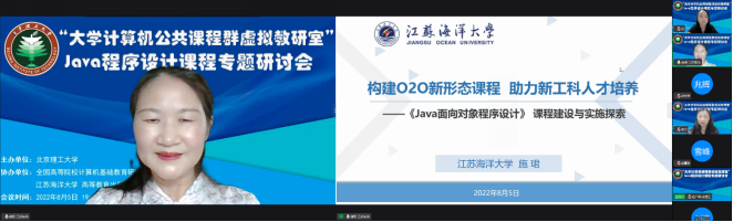 为推进由北京理工大学主持的“大学计算机公共课程群虚拟教研室”建设,打造开放、共建、共创、共享的教学创新共同体,大学计算机公共课程群虚拟教研室“Java程序设计”教学专题研讨会于2022年8月5日以线上形式成功举办并同步直播。本次研讨会由北京理工大学主办,全国高等院校计算机基础教育研究会理工专委会、江苏海洋大学及高等教育出版社协办,大学计算机公共课程群虚拟教研室成员高校80余名教师参加会议。会议由北京理工大学计算机学院陈宇峰副教授主持。我校Java程序设计教学团队作为大学计算机公共课程群虚拟教研室的重要成员,积极组织参与了这次研讨会。