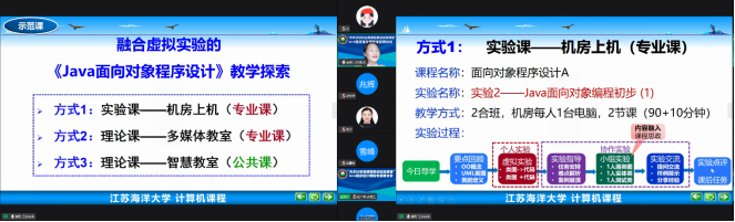施珺教授做了题为“构建O2O新形态课程 助力新工科人才培养——《Java面向对象程序设计》课程建设与实践探索”的教学报告,并展示了“融合虚拟实验的Java面向对象程序设计”示范课。施珺教授介绍了我校综合近年来高等教育发展趋势、人才培养需求、课程特点与信息化资源优势,围绕O2O新形态课程的建设目标,从重构教学内容、精编教学案例、融通教学资源、打造课程特色四个方面开展课程建设,实现了“线上课程资源+MOOC学习+虚拟实验”与“线下纸质教材+课堂教学+上机编程”的无缝对接、优势互补。