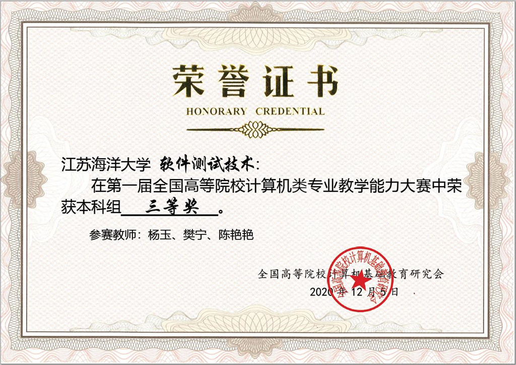 为贯彻落实《关于加快建设高水平本科教育全面提高人才培养能力的意见》,以立德树人为根本任务,提升教师团队模块化、项目化教学能力,并在疫情背景下推进混合式教育教学改革,全国高等院校计算机基础教育研究会特主办“第一届全国高等院校计算机类专业教学能力大赛”,于12月5日在海南省海口市隆重举行,来自全国100余所高校的130组团队参赛,我院杨玉老师团队的《软件测试技术》课程荣获本科组三等奖。