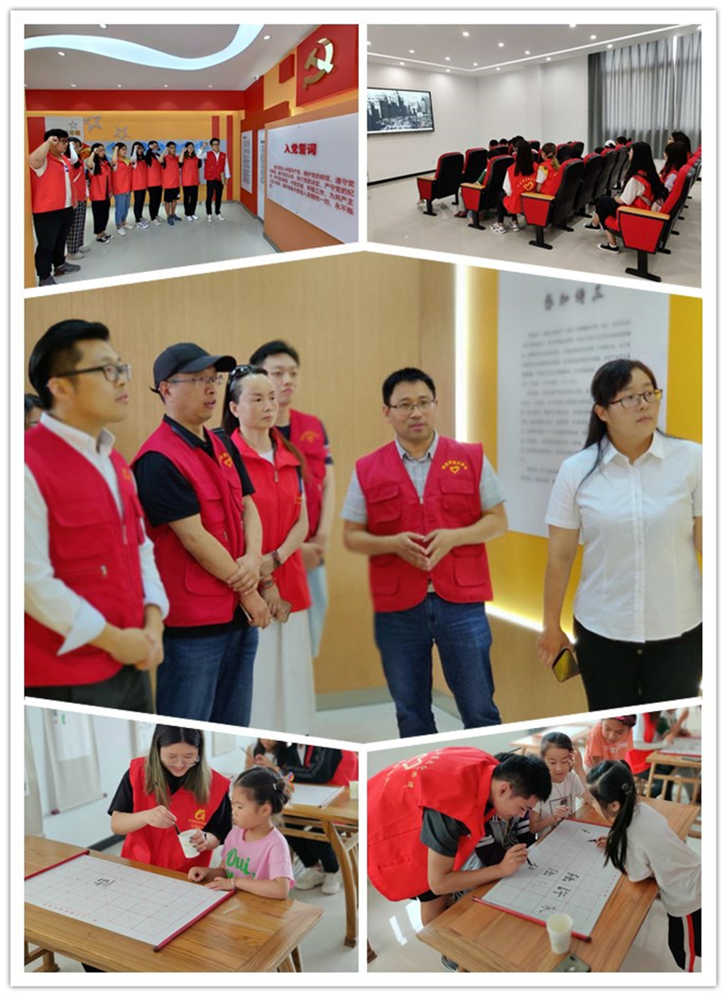 接着,师生党员分组分头开展了志愿服务活动,在红色影院同小朋友一起观看《建党伟业》、《中共一大》等影视视频;在老人活动室陪老爷爷下象棋;在书画园陪小朋友写毛笔字、画画等等。