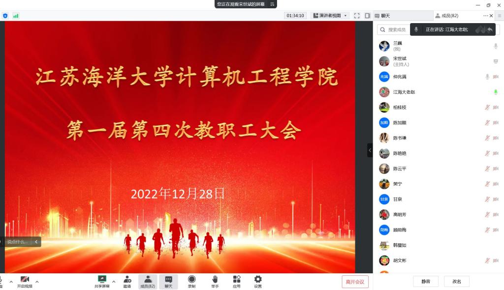 12月28日下午,计算机工程学院通过腾讯会议线上召开第一届第四次教职工大会,会议由学院党委书记唐瑶主持,学院全体教职工参加了会议。