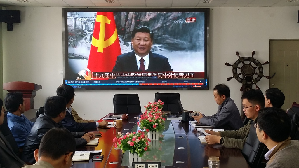 会上,大家首先观看了上午“新一届中央领导集体与记者见面会”的实况转播,接着学院党委副书记姜兵带领大家一起全文学习了人民网10月25日的社论“夺取新时代中国特色社会主义伟大胜利”文章,最后学院党委书记赵耀华带领大家一起学习了十九大报告中关于“新时代中国特色社会主义思想和基本方略”的部分。