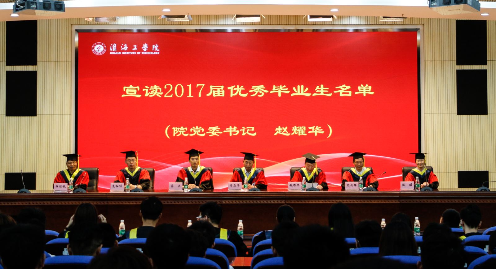 庄严的国歌声中,毕业典礼拉开序幕。院党委书记赵耀华宣读了表彰2017届优秀毕业生的决定,接着,副院长纪兆辉宣读2017届毕业生名单及获得学士学位学生名单。