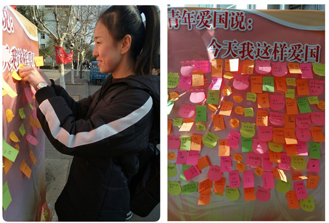 活动得到了过往同学的积极参与,“诚信待人”“爱护校园环境”“帮助学习上有困难的同学”……在“今天,我这样爱国”的话题下,他们纷纷留下自己的朴素却实际的爱国行动宣言。