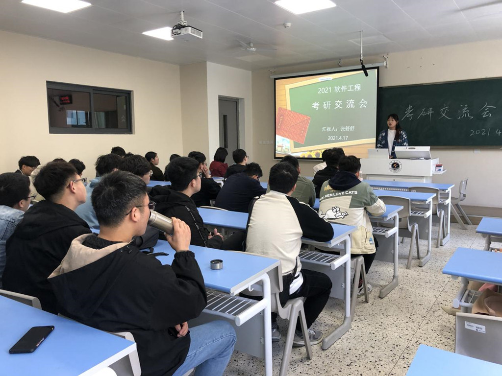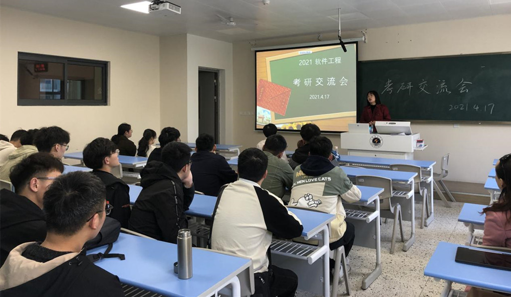 2021年4月17日上午9点,计算机工程学院软件工程系在文华楼207举办考研交流会。本次交流会邀请已考研结束的学长学姐来做经验交流分享,以及一些问题的答疑解惑。交流会由软件181班和软嵌181班班主任李慧老师和陈艳艳老师共同主持,两个班级的考研同学积极参加本次交流会,从考研时间规划,学习方法以及学校的考虑等各个方面进行详细阐述和建议。