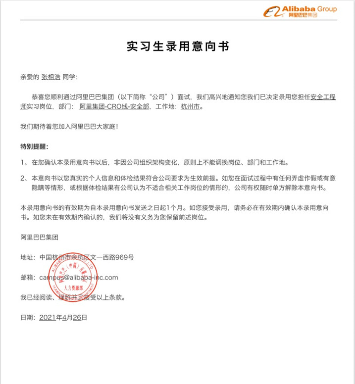 最新获悉,我院网络工程181班两名大三学生陈天池、张相浩先后于4月22日和26日收到阿里巴巴集团的实习生录用意向书,两位同学将赴阿里集团CRO安全部担任安全工程师实习岗位。