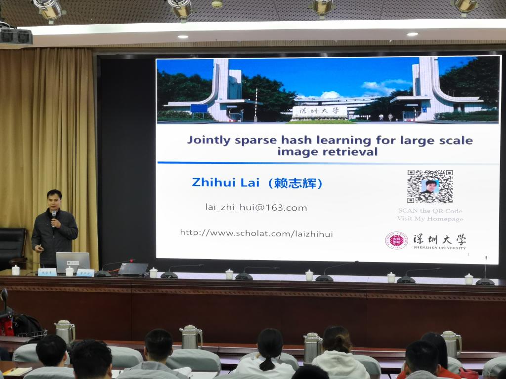 深圳大学赖志辉教授报告的题目为《联合稀疏哈希学习》。他首先介绍了在大规模数据的检索中受到广泛应用的哈希学习的相关知识,分析了大多数传统哈希学习方法利用放松离散约束来计算二进制代码导致信息损失不断增加的缺点。在报告中,他重点介绍了其团队的研究成果:提出了一个新的联合稀疏哈希学习方法以最小化局部信息损失,把局部性、联合稀疏性和旋转操作集成在一个无缝的框架中,并证明了该算法的收敛性及其迭代过程的数学机理;报告最后展示了在没有任何大数据处理技术的前提下,如何设计大数据哈希学习模型与算法。