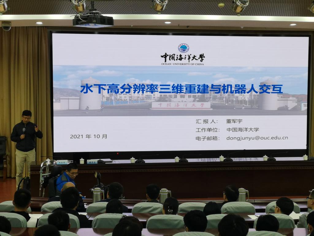 中国海洋大学董军宇教授报告的题目为《水下高分辨三维成像及机器人交互》。报告主要介绍基于光学的水下近距离三维成像系统,并在重构的水下三维环境中,利用增强现实技术辅助操作人员操控水下机器人的技术。报告中,他重点展示了其课题组在基于线激光的水下目标三维重建及基于水下三维场景解析的VR/AR机器人交互控制系统所取得的最新研究成果。报告最后给出了相关水下三维成像技术的具体扩展应用。