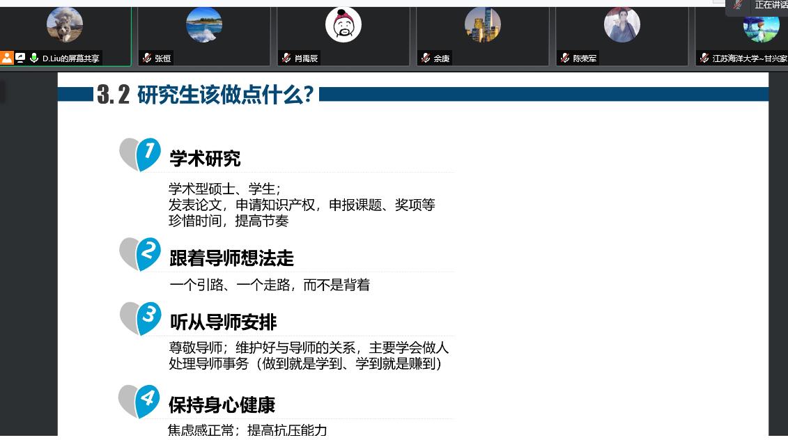 关于研究生应该做点什么,刘博士也从学术研究、导师关系、身心健康等几个方面做了详细指导,帮助研究生摆正心态。