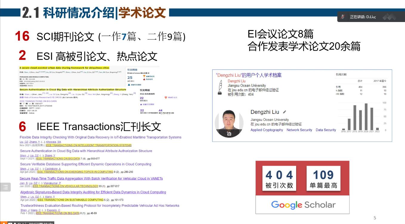 报告中,刘博士首先介绍个人学习经历及科研成果,以自身经历鼓励所有研究生积极主动做科研,与导师密切交流,同学之间也应当加强沟通,共同进步。
