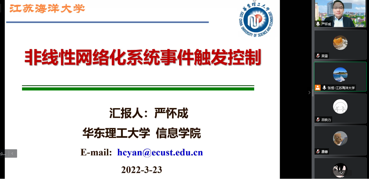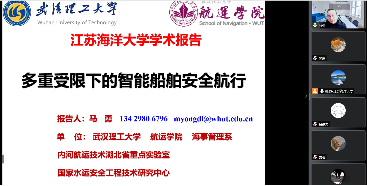 3月23日下午,江苏海洋大学计算机工程学院成功举办了“创新学术讲座”。讲座邀请了华东理工大学信息学院严怀成教授、武汉理工大学航运学院马勇教授、上海大学机电工程与自动化学院任肖强教授做学术报告。讲座由计算机工程学院副院长张恒教授主持,相关教师和研究生在线聆听了讲座。