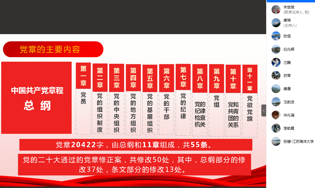 会上,集中学习了《中国共产党章程》(新修订)《推进领导干部能上能下规定》《中国共产党普通高等学校基层组织工作条例》以及《习近平经济思想学习纲要》《习近平生态文明思想学习纲要》的主要内容。