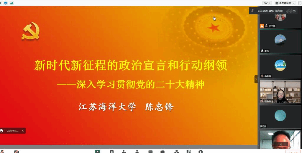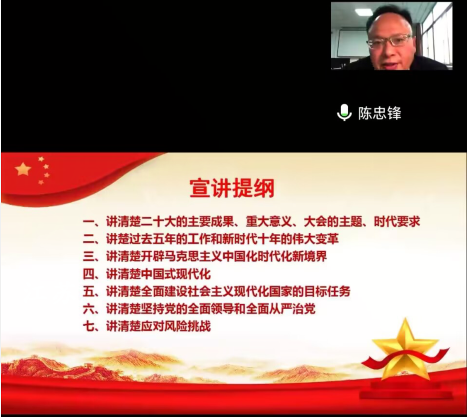 陈忠峰以“新时代新征程的政治宣言和行动纲领”为题,围绕“七个讲清楚”,对党的二十大报告进行了全面深入地辅导阐释。报告深刻阐述了过去五年的工作和新时代十年的伟大变革、开辟马克思主义中国化时代化新境界、中国式现代化、全面建设社会主义现代化国家的目标任务、坚持党的全面领导和全面从严治党以及应对的风险挑战等方面内容。