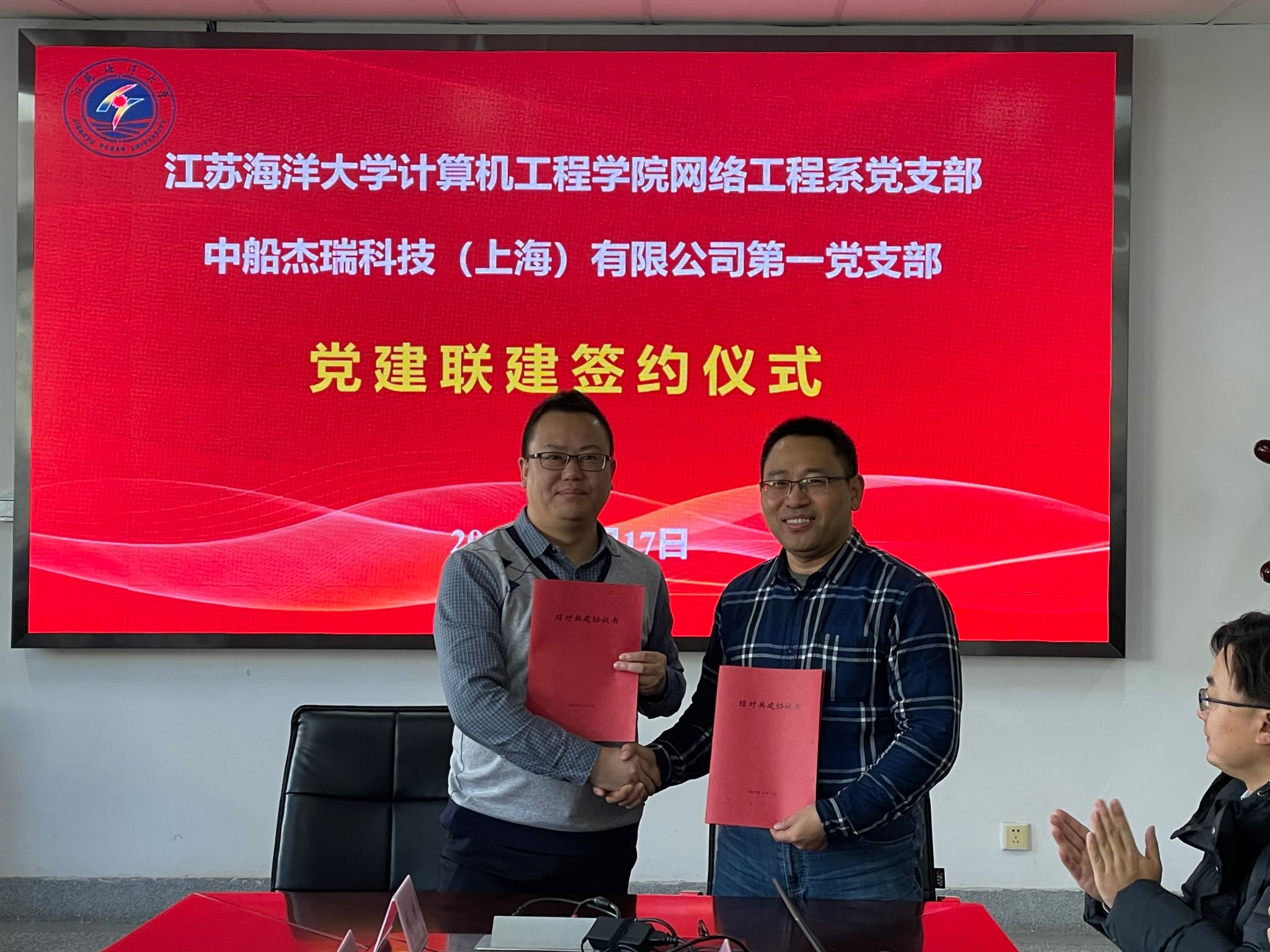 唐瑶首先对中船杰瑞科技(上海)有限公司各位党员一行表示诚挚的欢迎,并详细介绍了学院党建的基本情况以及网络工程系党支部在党建工作方面的特色、经验和取得的成果。作为计算机工程学院的校友,黄瑞对学院党委的精心安排表示感谢,并介绍了第一党支部基本情况及支部在开展主题教育方面的特色等。网络工程系党支部书记张勇与第一党支部书记章涛涛,分别代表双方签订了支部结对共建协议。希望通过党建共建的形式,充分发挥结对双方自身优势,推进党员“联学”、资源“联享”、服务“联动”、品牌“联创”,探索“党建+”校企联合党建新路,促进双方产教融合、同频共振,互惠互赢。