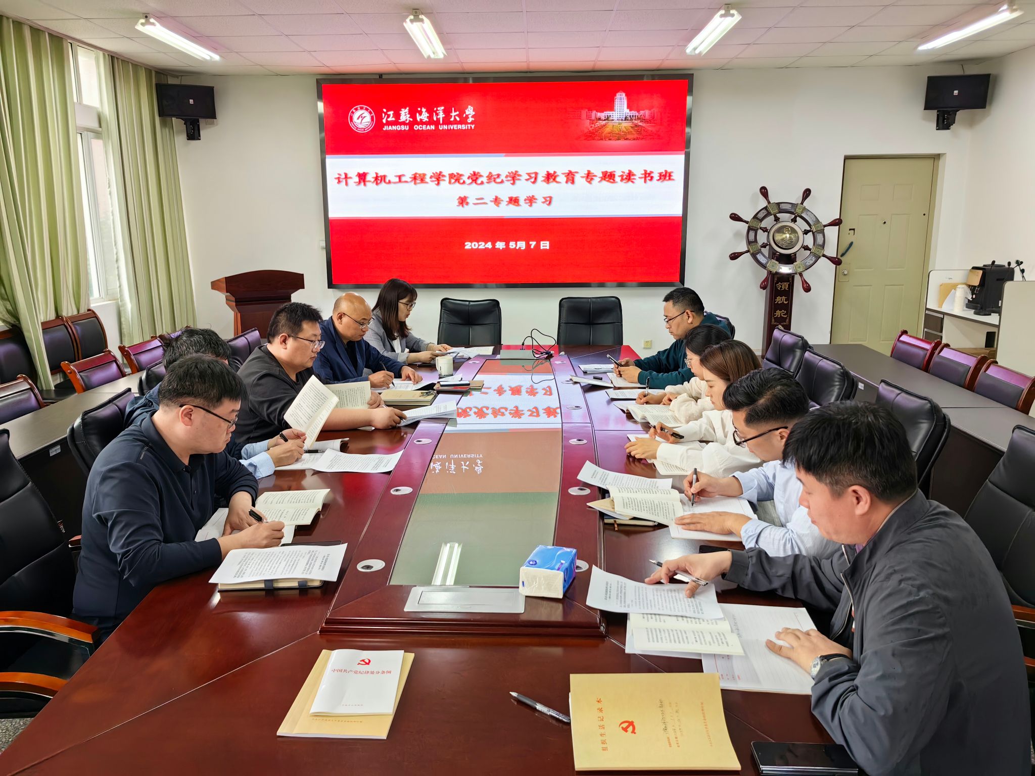 5月7日下午,计算机工程学院党委党纪学习教育专题读书班在306会议室开展第二次集中学习,专题学习了《中国共产党纪律处分条例》第二编分则第六章内容。学院领导班子成员、党支部书记参加学习会议。
