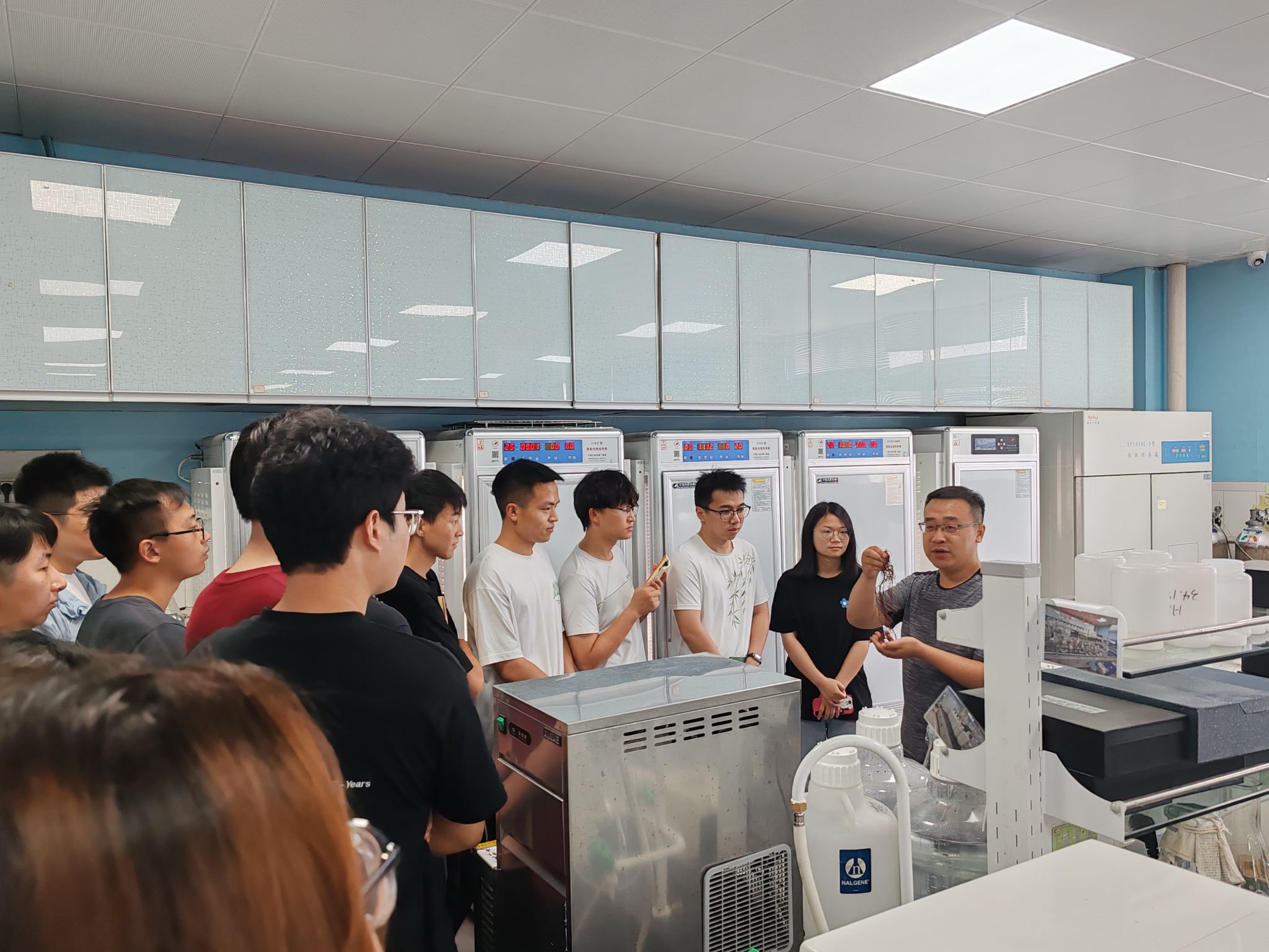 会后,全体留校研究生前往海洋科学与水产学院的藻类生物学实验室进行了参观学习。实验室的负责老师为同学们进行了深入的讲解,并针对研究生如何有效开展科学研究提出了指导建议。