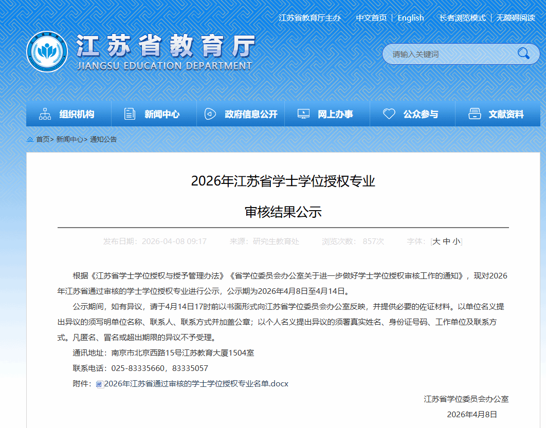 4月8日,江苏省教育厅公示了2026年江苏省通过审核的学士学位授权专业,我校的两个专业获得学士学位授权,我院的网络空间安全专业位列其中。