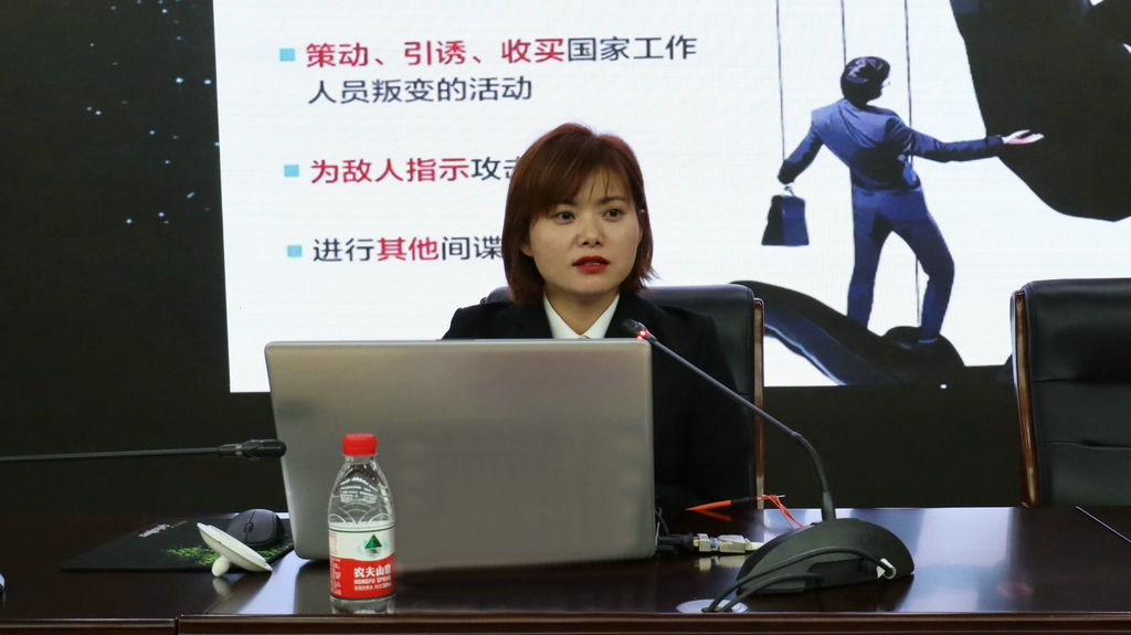 讲座接近尾声,同样来自市经济技术开发区法院民庭的周鹤法官又向同学们普及《反间谍法》的相关内容,结合实例指出在校大学生应更警惕被境外间谍策反利用,告诫同学们应予高度警惕,不断增强国家安全防范意识。