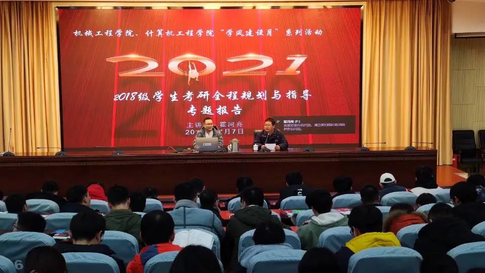 2020年12月7日晚,计算机工程学院和机械工程学院在黄海厅联合举办了2018级学生考研全程规划与指导报讲座,特邀海文考研霍河舟老师主讲。会议由计算机工程学院党委副书记兰巍主持,计算机工程学院和机械工程学院2018级意向考研学生200余人聆听了讲座。