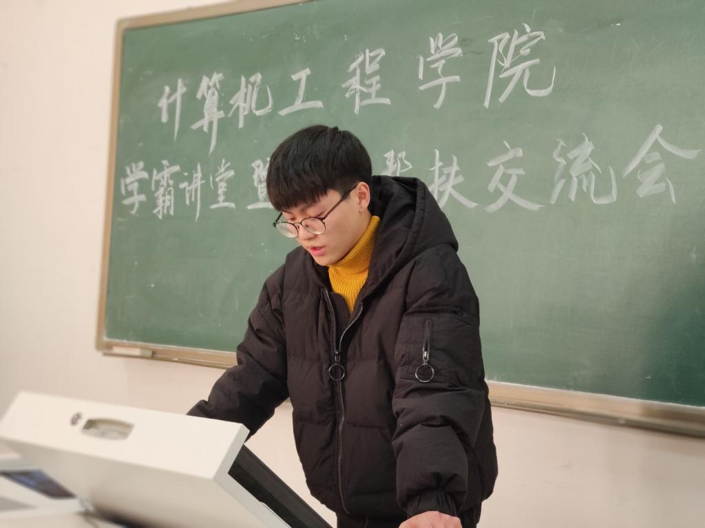 为加强学院学风建设,帮助学业困难学生尽快掌握大学学习方法,弥补薄弱环节,精准辅导,助力学业脱困。12月23日,计算机工程学院在文通楼111举行“学霸讲堂”暨朋辈帮扶交流会,计算机工程学院国奖获得者柯佳呈、徐李铭两位同学,全体党员朋辈帮扶团,学业困难全体同学参加交流会,交流会由学工办副主任唐康主持。