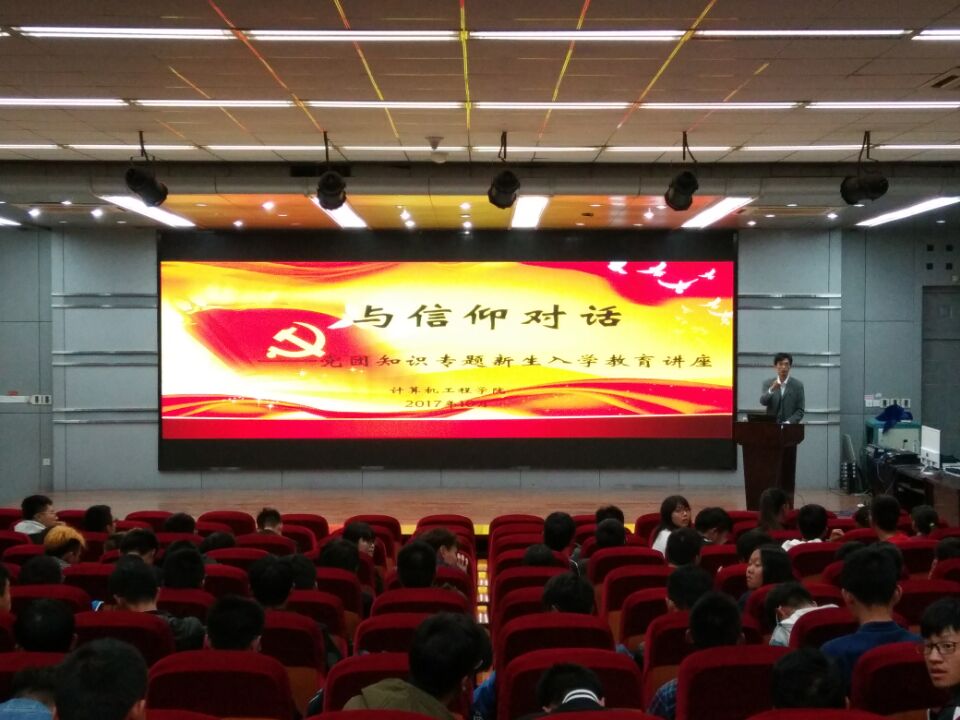 为将“两学一做”常态化教育工作落到实处,引导新生坚定理想信念,提升政治理论素养,从思想上、行动上不断向党组织靠拢,计算机工程学院于10月17日晚在艺术楼报告厅开展针对2017级新生的党团知识专题入学教育讲座,主讲人为院党委副书记姜兵。