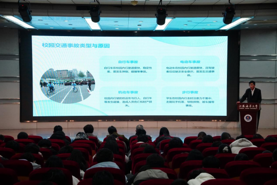 3月5日,活动启动仪式在学术会议中心黄海厅举行。连云港市交警高新大队大队长郭明旺、保卫处、学生工作处及各二级学院师生代表等300余人参加活动。保卫处副处长孙祖皓结合近年来高校交通安全典型案例,系统阐述了校园交通安全工作的重要意义。连云港市公安局交警支队高新大队刘东警官为大家做交通安全知识讲座。刘东通过警示案例视频、法规解读等形式,重点剖析了超速行驶、违规变道等违法行为的危害性,针对校园交通特点,就电动自行车规范骑行、夜间出行安全防护等实用知识进行专业指导。