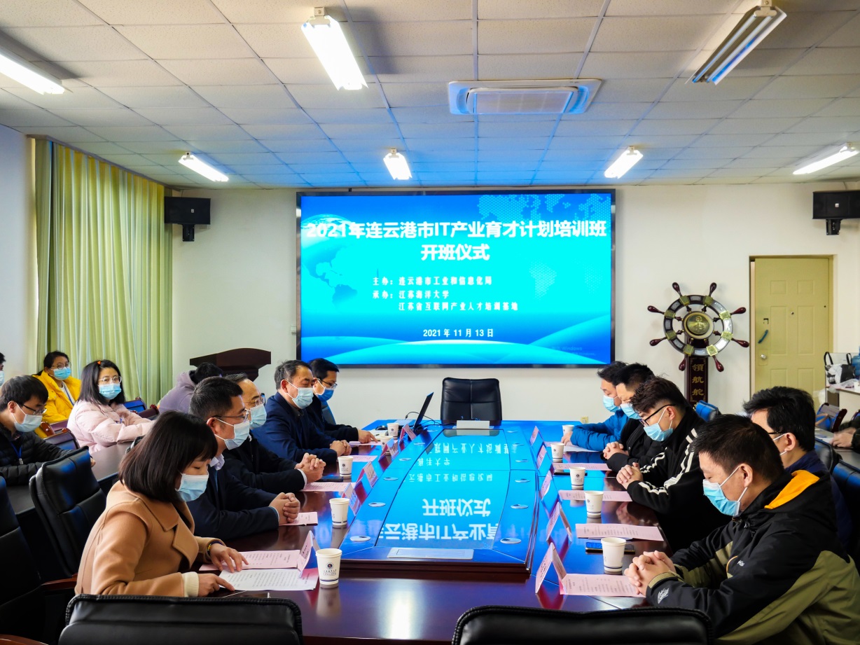 11月13日,连云港市2021年软件产业育才计划培训开班仪式在计算机工程学院306会议室举行。本次培训由连云港市工业和信息化局主办,江苏海洋大学计算机工程学院(江苏省互联网产业人才培训基地)承办。连云港市工信局副局长严道连、江苏海洋大学计算机工程学院院长李存华、江苏杰瑞信息科技有限公司总经理吴茂传出席开班仪式并讲话,来自全市各软件企业的40余名学员参加了开班仪式。